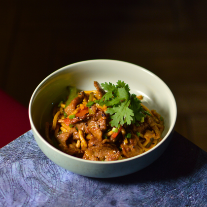 Традиционная китайская лапша, креветки, мидии, кальмары, обжаренные с овощами (лук репчатый, перец болгарский, кунжут, лук зеленый) в фирменном соусе