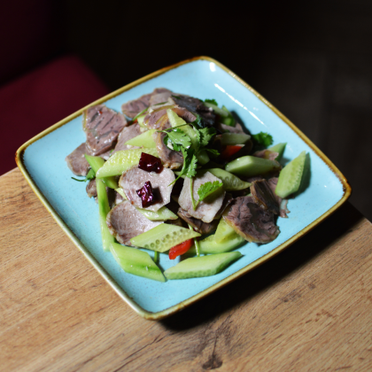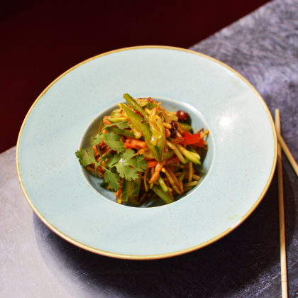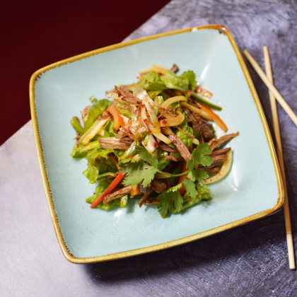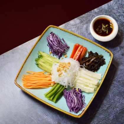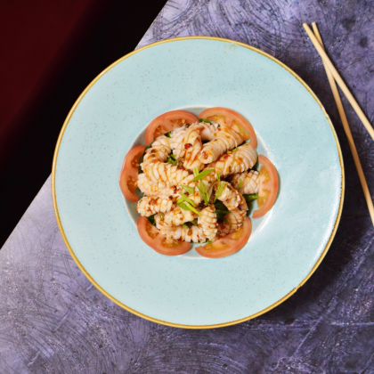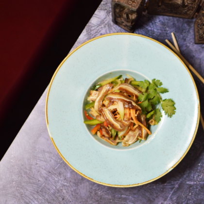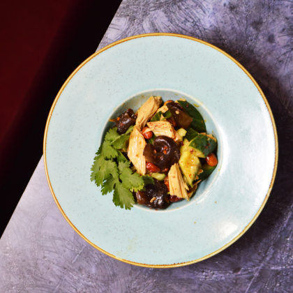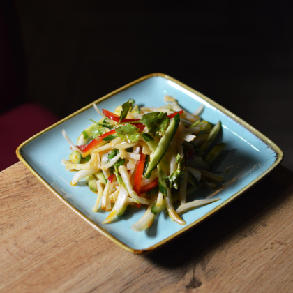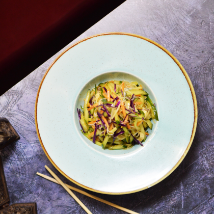 Салат с грибами эноки — отличный выбор! Свежий огурец и кинза, дополненные фирменным соусом, раскроют вкус грибов Эноки по-новому